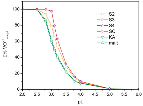 The obtained curves are shown in Figure 7. Σ%VO2+compl was calculated at pH 5.5 and I = 0.1 molL−1. At this pH value, the ligands exhibit their maximum binding capacity. For ka and maltol, the chemical models proposed by Buglyó et al. [18] were used and the formation constants were extrapolated at ionic strength 0.1 molL−1 using an expanded Debye–Hückel equation [30]. The sequestering ability of the ligands S3, S4, and SC are very similar and their curves are overlaid; moreover, they show higher sequestering capability with respect to ka or maltol.