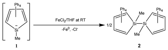 Hong J-H. Synthesis of 1,1′-Bis(1-Methyl/Chloro-2,3,4,5-Tetraphenyl-1-Silacyclopentadienyl) [Ph4C4Si(Me/Cl)-(Me/Cl)SiC4Ph4] from Silole Anion [MeSiC4Ph4]−•[Li+ or Na+] and Silole Dianion [SiC4Ph4]2−•2[Li+]; Oxidative Coupling of Silole Anion [MeSiC4Ph4]−•[Li+ or Na+] by Ferrous Chloride (FeCl2) and Oxidative Coupling and Chlorination of Silole Dianion [SiC4Ph4]2−•2[Li+] by Cupric Chloride (CuCl2). Molecules. 2019; 24(20):3772. https://doi.org/10.3390/molecules24203772