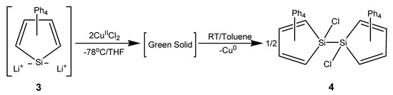 Hong, J.-H. Synthesis of 1,1′-Bis(1-Methyl/Chloro-2,3,4,5-Tetraphenyl-1-Silacyclopentadienyl) [Ph4C4Si(Me/Cl)-(Me/Cl)SiC4Ph4] from Silole Anion [MeSiC4Ph4]−•[Li+ or Na+] and Silole Dianion [SiC4Ph4]2−•2[Li+]; Oxidative Coupling of Silole Anion [MeSiC4Ph4]−•[Li+ or Na+] by Ferrous Chloride (FeCl2) and Oxidative Coupling and Chlorination of Silole Dianion [SiC4Ph4]2−•2[Li+] by Cupric Chloride (CuCl2). Molecules 2019, 24, 3772. https://doi.org/10.3390/molecules24203772