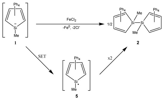 - Sohn, H.; Powell, D.R.; West, R.; Hong, J.-H.; Joo, W.-C. Dimerization of the silole anion [C4Ph4SiMe]− to a tricyclic diallylic dianion. Organometallics 1997, 16, 2770–2772. [Google Scholar] [CrossRef]