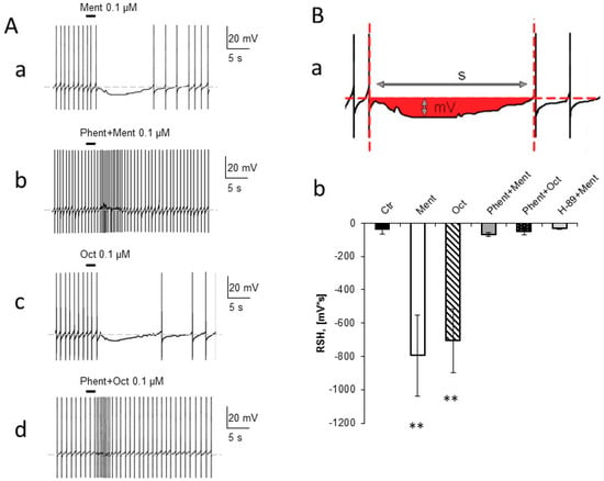 Very similar observations were made for 0.1 µM octopamine (Figure 1(Ac,Bb)), which caused hyperpolarization related to the lack of ability to generate action potentials. RSH value after its application was equal to −705.45 ± 190.47 mV*s and the difference with the control was significant with p = 0.0032. There was no difference with menthol trial.