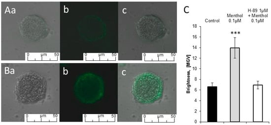 Fluorescent marker of free calcium ions, Oregon Green BAPTA-1 at a concentration of 5 µM was applied for 1 h in the dark. Next, the liquid was removed, and cells were rinsed with fresh physiological saline. Firstly, the control observations were made. Menthol 0.1 µM was then applied in the bath and after 15 min the cells were observed. In case of pre-incubation with H-89 1 µM, the inhibitor was applied 10 min before menthol. The images were captured with a Leica TCS SP8 confocal microscope using an argon-ion laser emitting light at a wavelength of 488 nm (408 nm excitation wave). Optimized pinhole, long exposure time (400 kHz), and 20X (numerical aperture, 1.4) Plan Apochromat DIC H lens were used. For the quantitative measurements, each experiment was performed under condition of consistent temperature, incubation time, and concentrations of probes. The images were collected under consistent conditions of acquisition (low laser power at 3%, emission band, gain, and resolution) to ensure comparable results. For bleed-through analysis and control experiments, LASX program (Leica Application Suite X) software was used. Between 10 and 20 cells were analyzed for each experimental variant. The level of fluorescence was expressed in arbitrary units (as the mean intensity per μm2). The statistical analysis was performed using SigmaPlot 11.0 software. The statistical significance was determined by one-way ANOVA followed by Tukey’s post-hoc test (p < 0.01 or p < 0.001) to compare effects of different treatments.