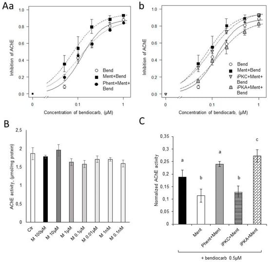 Biochemical analysis of acetylcholinesteraze (AChE) activity and its inhibition by bendiocarb insecticide. (A) Dose-inhibition curves representing inhibitory effect of bendiocarb on AChE activity: (a) Dose-dependency of AChE inhibition caused by bendiocarb (Bend) was shifted to its lower concentrations in the presence of menthol (0.1 µM, Ment + Bend). The effect of menthol was reversed by phentolamine (10 mM, Phent + Ment + Bend); (b) Dose-dependency of AChE inhibition caused by bendiocarb (Bend) was shifted to its lower concentrations in the presence of menthol (0.1 µM, Ment + Bend). The effect was reversed by protein kinase A inhibitor, H-89 (1 µM, iPKA + Ment + Bend) but not by protein kinase C inhibitor, bisindolylmaleimide IX (1 µM, iPKC + Ment + Bend). (B) Menthol applied in different concentrations (M) did not changed the AChE activity compared to control (Ctr). (C) Inhibition of AChE activity by bendiocarb (0.5 µM, black bar) and the changes caused by: menthol (0.1 µM, Ment); phentolamine (10 µM) with menthol (0.1 µM, Phent + Ment); inhibitor of protein kinase C, bisindolylmaleimide IX (1 µM) with menthol (0.1 µM, iPKC + Ment); and the inhibitor of protein kinase A, H-89 (1 µM) with menthol (0.1 µM, iPKA + Ment). The different letters above the bars refer to statistically significant differences between the data with p < 0.05.