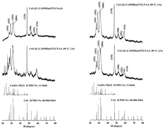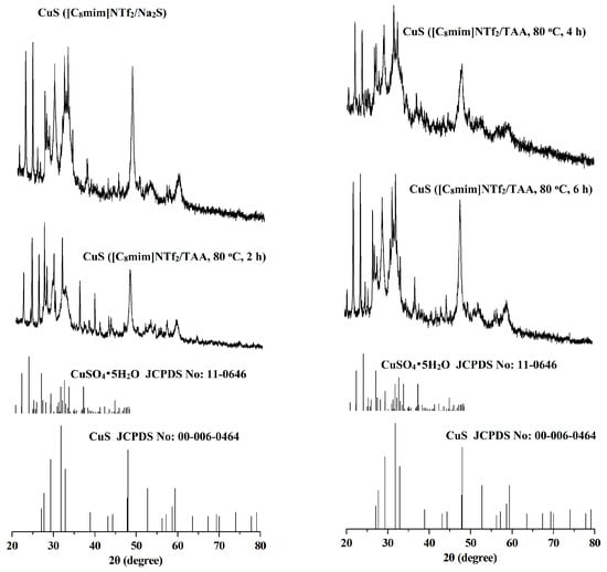 The crystal structures and phase purity of the CuS prepared by different systems were investigated by X-ray diffraction (XRD). The results are shown in Figure 1 and Figure 2. As can be seen from the two figures, for the CuS nanoparticles prepared from the interfaces of the [C8mim]NTf2/water systems and the [C4C2OOHim]NTf2/TAA system (80 °C, 2 h), there are some impurity peaks in the XRD spectra, which are the characteristic signals of CuSO4•5H2O. Meanwhile, a higher purity of CuS can be obtained when the [C4C2OOHim]NTf2/Na2S system is used as the reaction medium, which may ascribed to its acidic nature and strong complexation ability of the carboxyl group in the [C4C2OOHim]NTf2 with Cu2+. As shown in Figure 2, for the [C4C2OOHim]NTf2/TAA system, the heating time is also a key factor that affects the product’s purity. A shorter heating time (2 h) leads to small amounts of impurities in the product, and there are no impurity peaks found in the XRD spectra when the heating times were set at 4 h and 6 h.