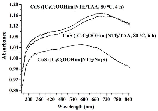 The UV/Vis absorption spectra of the resulting CuS products are shown in Figure 5. It is clear that all the spectra show strong absorption feature in the UV/Vis region, which suggests the potential application of CuS in the fields of solar cells and photocatalysts. Moreover, the absorption peak of the CuS prepared from the [C4C2OOHim]NTf2/Na2S system (maximum absorption wavelength is around 582 nm) show a blue shift compared with the absorption peaks of the CuS produced from the [C4C2OOHim]NTf2/TAA system (maximum absorption wavelengths are about 679 nm), implying that the CuS nanoplates synthesized from the [C4C2OOHim]NTf2/Na2S system are more uniform in size and morphology (Figure 4) [].