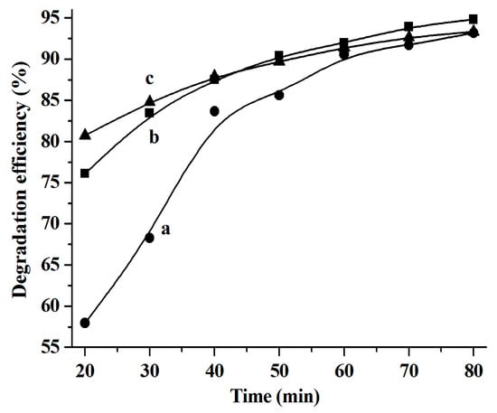 The photocatalytic activity of the prepared CuS nanoparticles was evaluated by degrading the model compound, RhB, in aqueous media under natural sunlight irradiation. The experiments were conducted according to the procedures reported in the literature [,,,]. Typically, 5.0 mg of CuS nanoparticles was added in the RhB solution (25 mL, 10 mg L−1) and the resultant reaction mixture was magnetically stirred in the dark for 30 min to obtain adsorption–desorption equilibrium. After that, a certain amount of H2O2 (30 wt.%) was added into the reaction mixture, and the photocatalytic degradation of RhB was initiated by natural light irradiation. The RhB concentration in the reaction mixture was measured by an ultraviolet-visible (UV/Vis) spectrophotometer (model TU-1810, Purkinje General Instrument Co., Beijing, China) at 550 nm. The degradation efficiency was calculated by using the following equation:
