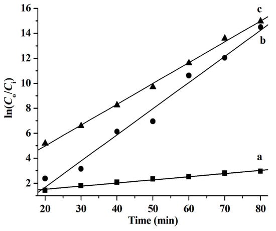 It has been reported that CuS nanoparticles are good photocatalysts for the degradation of organic dyes, such as RhB [,,,,,]. Herein, the photocatalytic performance of the as-synthesized CuS nanostructures for the degradation of RhB in the presence of H2O2 under natural light irradiation at ambient temperature was investigated. The results shown in Figure 6 illustrate that all the as-synthesized CuS nanoparticles exhibit high photocatalytic activity and over 90% of the RhB is decomposed after 60 min. To further characterize the catalytic performance of the prepared CuS, the relationship between ln (Co/C) and degradation time (min) was studied and the results shown in Figure 7 suggest that the RhB degradation conforms to the first-order kinetic model, which is in good agreement with the observations reported in the literature [,,]. The RhB degradation kinetics can be expressed by the following equation:
