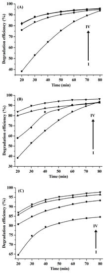 The influence of H2O2 dosage on the degradation efficiency of the RhB catalyzed by CuS prepared from different systems. (A) [C4C2OOHim]NTf2/Na2S system, (B) [C4C2OOHim]NTf2/TAA system (80 °C, 4 h) and (C) [C4C2OOHim]NTf2/TAA system (80 °C, 6 h); 5 mg of CuS, 25 mL of RhB (10 mg L−1); from I to IV, 0.59% of H2O2, 1.2% of H2O2, 1.7% of H2O2, and 2.2% of H2O2, respectively.