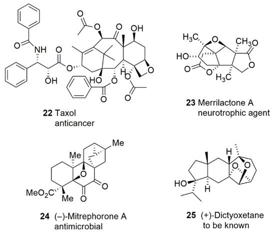 The most famous example could be Taxol (Figure 3) which is widely used to treat many types of cancers, such as breast cancer [61,62,63], ovarian cancer [64,65,66], lung cancer [67,68,69], cervical cancer [70,71,72], etc. Taxol and its semi-synthetic derivative cabazitaxel furthered interest in the study of oxetanes. Despite anticancer activity, oxetanes containing natural products exhibit many more pharmacological properties. Merrilactone A 23 has a unique sesquiterpene bearing two γ-lactones; an oxetane ring was isolated from the pericarps of Illicium merrillianum. The presence of an oxetane ring was required for neurotrophic activity. However, the isolation yield was only 0.004% [73]. Hence, total synthesis is fundamental for further biological research of merrilactone A. Mitrephorone A 24 is a compound isolated from the Bornean shrub Mitrephora glabra and displays potent cytotoxicity against a panel of cancer cells as well as featuring excellent antimicrobial activity [74]. It contains a fully substituted oxetane embedded in a pentacyclic carbon skeleton with a rare 1,2-diketone. This combination makes this natural product a veritable challenge for synthetic chemistry. The biological activities of some oxetanes containing natural products remain unavailable for many years due to the rareness and difficulty of chemical preparation, namely, (+)-dictyoxetane 25 [75].