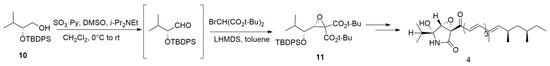 Tanaka et al. [27] accomplished the first asymmetric total synthesis of L-755,807 via a diastereoselective Darzens reaction (Scheme 2). Alcohol 10 was converted to an intermediate aldehyde using Parikh–Doering oxidation. Without further purification, the aldehyde was treated with bromo di-tert-butyl malonate pre-treated with lithium bis(trimethylsilyl)amide (LHMDS); the reaction proceeded cleanly to give only the desired diastereomer 11 in high yield. This strategy decreased the number of reaction steps and avoided side reactions. Further study showed that this reaction can be applied on aldehydes bearing a branched or an unbranched alkyl side chain. Moreover, two aromatic aldehydes were evaluated but a low yield was observed in each case [46]. The essential factor for high diastereoselectivity and yield might be attributed to the formation of a metal-cation-mediated rigid structure during the reaction [28]. Because researchers are still developing new chiral organocatalysts, the substitute scope of the highly enantioselective asymmetric Darzens reaction is expanding [47]. Moreover, shorter reaction times were achieved by using aqueous media in the presence of a Li+-containing base, a phase-transfer catalyst and granular polytetrafluoroethylene under mechanical stirring [48]. These developments make the Darzens reaction a promising method for the synthesis of natural products in an efficient and green way.