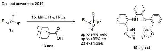 In an intriguing epoxidation of olefins with H2O2, Dai et al. [53] demonstrated that cis, trans, and terminal together with trisubstituted olefins can be converted to epoxides using an inexpensive and readily available in situ-formed manganese complex in excellent yields and enantioselectivities (Scheme 3). The additive adamantane carboxylic acid (aca) was found to be essential in improving the enantioselectivity. The supposed reason is that the sterically hindered aca could impart a highly rigid environment around the metal center.