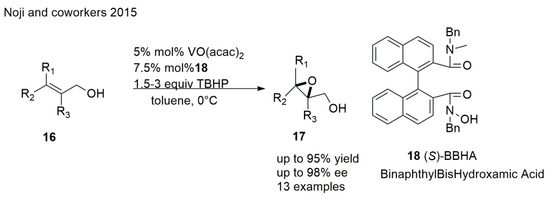 Sharpless asymmetric epoxidation of allylic alcohols is a reliable and commonly used method of obtaining chiral epoxy alcohols; it gives high asymmetric induction for various types of allylic alcohols and provides predictable configuration of the products. However, it requires strict anhydrous conditions. A good solution to this problem may be the development of vanadium–chiral hydroxamic acid (V−HA) complex-catalyzed AE. Noji et al. [54] disclosed a highly potent approach to obtaining chiral epoxy alcohols of 2,3,3-trisubstituted allylic alcohols using the vanadium–binaphthylbishydroxamic acid (BBHA) complex (Scheme 4). This method allows a simple reaction procedure which can be conducted in aqueous TBHP solutions and offers good yields and ee. Noji et al. [55] recently reported a great achievement in this field. They developed an immobilized polymer-supported vanadium-binaphthylbishydroxamic acid (PS-VBHA) that can be easily recycled and reused over five consecutive runs without significant sacrifice of catalytic activity or enantioselectivity. It would not be unrealistic to say that the application of chiral hydroxamic-acid ligands as enantioselective catalysts and the development of PS-VBHA will contribute to the application of sustainable green processes for various asymmetric oxidations.