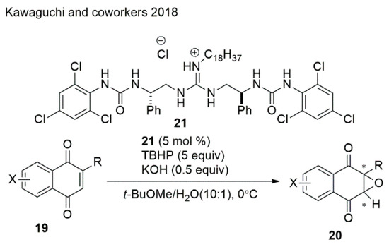 Quinone epoxides are important synthetic intermediates for biologically active molecules. Nevertheless, it is difficult to apply AE on quinones because of their highly symmetric and planar structures with two carbonyl groups; therefore, differentiating the si- and re-faces of the olefins with chiral oxidants or catalysts is challenging. Kawaguchi et al. [56] developed an asymmetric epoxidation of 1,4-naphthoquinones catalyzed by guanidine−urea bifunctional organocatalysts with TBHP as an oxidant, resulting in the desired epoxides with 85:15−95:5 er in 71%−98% yields (Scheme 5).