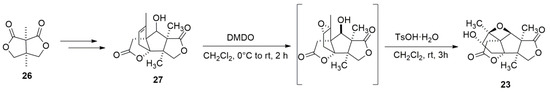 A good example of using epoxide ring expansion to form oxetanes is the total synthesis of merrilactone A. Since its isolation in 2000, merrilactone A has been consistently appealing to researchers. Over the years, several different routes towards the total synthesis of merrilactone A have been reported [77,78,79,80,81]. Most recently, Liu and Wang [82] designed and achieved a concise synthesis of merrilactone A in a racemic form (Scheme 6). In their synthesis work, exploiting dimethyldioxirane (DMDO) on 27 allowed the epoxide intermediate that was subjected to acidic conditions to afford synthetic merrilactone A through the epoxide-opening oxetane formation.