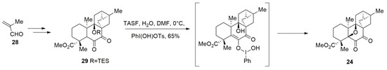 Richter et al. [83] reported the first and enantioselective synthesis of (−)-mitrephorone A in 2018 by using a novel late-stage oxidative cyclisation (Scheme 7). Synthesis commenced with methacrolein 28 and gave 29 in steps. Finally, the pivotal oxetane moiety was generated via one-pot deprotection of silyl ether 29 (TASF) and subsequent reaction with Koser’s reagent (PhI(OH)OTs) to successfully complete the total synthesis of (−)-mitrephorone A.