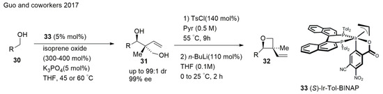 Impressive synthetic approaches toward C–C bond-forming hydrogenations and transfer hydrogenations were developed. Guo et al. [84] achieved access to oxetanes bearing all-carbon quaternary stereocenters readily prepared through the iridium catalyzed anti-diastereo and enantioselective C–C coupling of primary alcohols and isoprene oxide (Scheme 8). A group of primary alcohols 30 were exposed to isoprene oxide (300 mol%) and potassium phosphate (5 mol%) in the presence of the chromatographically purified π-allyliridium C,O-benzoate complex modified by (S)-Tol-BINAP in a tetrahydrofuran solvent at 60 °C to give adducts 31. Conversion of the diol-containing adducts to the corresponding oxetanes 32 were accomplished through highly chemoselective tosylation of the primary alcohol moiety followed by SN2 cyclisation [84].