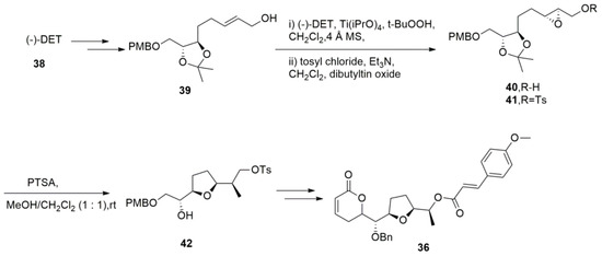 Raju et al. [98] reported the first stereoselective total synthesis of brevipolide M with the readily available (−)-DET (Scheme 9). In this synthesis, allylic alcohol 39 was treated with Sharpless asymmetric epoxidation to provide the chiral epoxy alcohol 40 followed by tosylation of the primary alcohol. Treating tosyl compound 41 with PTSA in MeOH/CH2Cl2 (1:1) at rt for 2 h resulted in the deprotection of the acetonide group and the spontaneous cyclisation of hydroxy epoxide, giving the desired syn-tetrahydrofuran 42 in an 85% yield. Other key steps involved Brown’s allylation, the RCM reaction to install an α- and β-unsaturated lactone ring, and the inversion of the C-6′ stereogenic hydroxyl group using the Mitsunobu reaction furnished brevipolide M.
