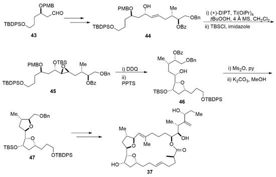 Another example of THF construction is via the intramolecular addition of alcohols to epoxide. A good example of using this strategy is the total synthesis of iriomoteolide-2a by Sakamoto (Scheme 10) [99]. The gross structure of iriomotelide-2a consists of an unusual 23 membered macrocyclic backbone with a characteristic bis(tetrahydrofuran) substructure and a complex side chain containing four stereogenic centers. The efforts to achieve the bis(tetrahydrofuran) unit is a fundamental part of total synthesis. In Sakamoto’s approach, Sharpless epoxidation of 44 followed by the first THF ring formation using the intramolecular addition of alcohols to epoxide gave alcohol 46. After mesylation, cleavage of the benzoyl group and concomitant cycloetherification in the basic condition furnished bis(tetrahydrofuran) 47 [100].