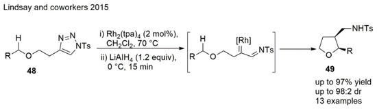 A stereodivergent intramolecular Rh-catalyzed azavinyl carbenoid C(sp3)−H insertion reaction was achieved by Lindsay et al. (Scheme 11), which allowed the formation of cis-2,3-disubstituted THFs. Good yields were observed and the resulting THF products were transformed to ring-fused THFs efficiently [101].