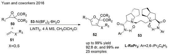 Oxiranes have become interesting precursors in the last few years. Yuan et al. [102] demonstrated an efficient diastereo- and enantioselective [3 + 2] cycloaddition of heterosubstituted alkenes with oxiranes via selective C−C bond cleavage of epoxides to give chiral THFs (Scheme 12). The reaction was catalyzed by a chiral N,N′-dioxide/Ni(II) catalyst which was derived from L-ramipril (Ra) by complexing with Ni(BF4)2·6H2O. The enantioselectivity was found to increase little by little as the steric hindrance at the ortho positions of the aniline of N,N′-dioxide ligands or on the heterosubstituted alkenes became larger.