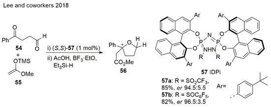 Asymmetric nucleophilic additions to keto aldehydes in the presence of enantiomerically pure imidophosporimidates (IDPis) interestingly shows that ketone reacts preferentially over the aldehyde. This method provides 2,2-disubstituted THF analogues with tetrasubstituted stereogenic centers starting from 1,4-dicarbonyl compounds [103] (Scheme 13). Moreover, 2,2,5,5-tetrasubstituted THFs can be readily prepared using the described method.