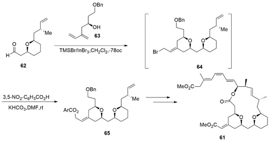 Li et al. [120] described a Prins cyclisation/homobromination process that involved dienyl alcohol with aldehyde to construct cis-THP containing an exocyclic E-alkene by using TMSBr/InBr3 as a combined bromide source and a Lewis acid. This approach provides good-to-excellent cis-E stereochemical control in one step, and this reaction was soon employed in the total synthesis of (−)-exiguolide 61 (Scheme 14). The ester substituted 65 was delivered at 71% yield with a cis/trans ratio of ≥95:5 and a Z/E ratio of 95:5 [121].