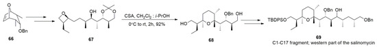 The THP formation was observed during Jacobsen et al.’s study of the enantioselective intramolecular opening of oxetanes for obtaining enantioenriched THFs [122]. In 2014, Yadav et al. [123] disclosed that exposing oxetanes to acids in the presence of aprotic solvents can afford THPs smoothly. The best solvent condition was found to be a mixture of CH2Cl2 and i-PrOH (15:1), in which oxetane substrates were converted into THPs at high yields within two hours. This newly developed methodology was successfully applied to the synthesis of the THP motif of salinomycin (Scheme 15).