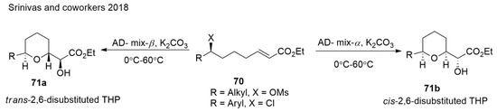 Srinivas et al. [124] demonstrated an efficient one-pot protocol to obtain THPs via the diastereoselective tandem dihydroxylation of ζ-mesyloxy α,β-unsaturated esters followed by SN2 cyclisation (Scheme 16). The highlight of this method is that it allows both cis- and trans-THP rings to be synthesized starting from a common precursor. This protocol also demonstrated the formal synthesis of (+)-muconin in a concise and highly stereoselective manner.