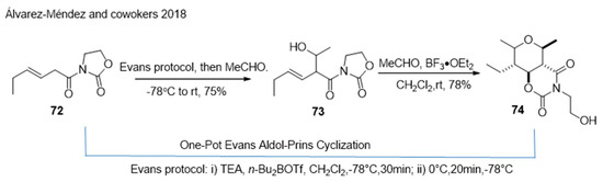 - Alvarez-Mendez, S.J.; Farina-Ramos, M.; Villalba, M.L.; Perretti, M.D.; Garcia, C.; Moujir, L.M.; Ramirez, M.A.; Martin, V.S. Stereoselective Synthesis of Highly Substituted Tetrahydropyrans through an Evans Aldol-Prins Strategy. J. Org. Chem. 2018, 83, 9039–9066. [Google Scholar] [CrossRef]