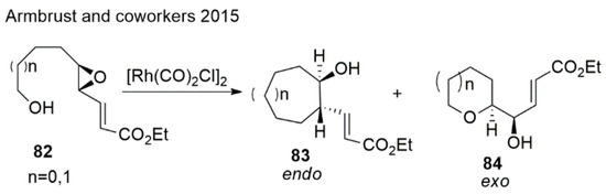 - Armbrust, K.W.; Beaver, M.G.; Jamison, T.F. Rhodium-Catalyzed Endo-Selective Epoxide-Opening Cascades: Formal Synthesis of (−)-Brevisin. J. Am. Chem. Soc. 2015, 137, 6941–6946. [Google Scholar] [CrossRef] [PubMed]