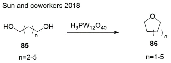 - Sun, Y.; Huang, Y.; Li, M.; Lu, J.; Jin, N.; Fan, B. Synthesis of cyclic ethers by cyclodehydration of 1, n-diols using heteropoly acids as catalysts. Royal Soc. Open Sci. 2018, 5, 180740. [Google Scholar] [CrossRef] [PubMed]
