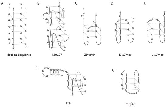 - Ojwang, J.O.; Buckheit, R.W.; Pommier, Y.; Mazumder, A.; Reymen, D.; Pallansch, L.A.; Vreese, K.D.E.; Lackman-smith, C.; Wallace, T.L.; Clercq, E.D.E.; et al. T30177, an Oligonucleotide Stabilized by an Intramolecular Guanosine Octet, Is a Potent Inhibitor of Laboratory Strains and Clinical Isolates of Human Immunodeficiency Virus Type 1. Antimicrob. Agents Chemother. 1995, 39, 2426–2435. [Google Scholar] [CrossRef]