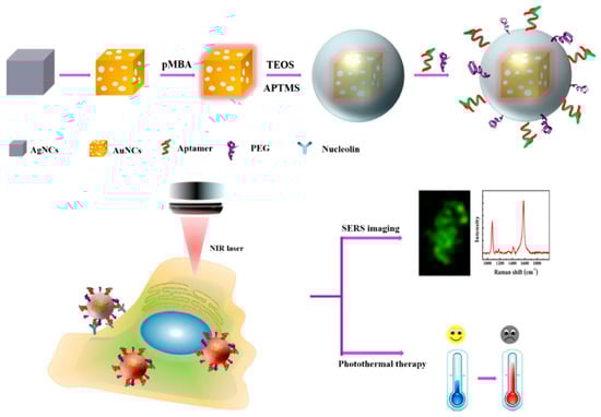 The AS1411 aptamer, in addition to its anticancer and antiviral activity, is used for developing aptasensors. This aptamer can be applied as a fluorescent aptasensor for Cu2+ detection characterized by high affinity and specificity. Copper is an essential element for diverse processes in biological systems such as oxidative stress protection, cell growth, and development, it helps to heal injured human skin tissues and is involved in pigmentation []. The established aptasensor was applied to diagnose diseases such as Alzheimer’s disease, Wilson’s disease, and diabetes []. The mechanism of this fluorescent aptasensor is based on the selective recognition of Cu2+ that binds to AS1411 on the surface of magnetic beads, hindering the hybridization of AS1411 with complementary strand and resulting in a weak fluorescence. On the contrary, in the absence of Cu2+, AS1411 can bind to its complementary strand, generating a high fluorescent signal upon the addition of gel red. It was demonstrated that the aptasensor could efficiently differentiate between patients suffering from these diseases and healthy people based on their serum Cu2+ levels. This confirmed that the developed system could be applied as a novel diagnostic tool for these diseases. The nanoprobe, formed by an Au nanocage coated with SiO2 (AuNC/ SiO2), uses the AS1411 aptamer as a bifunctional theranostic platform for cellular surface-enhanced Raman scattering (SERS) imaging and NIR-triggered photothermal therapy (Figure 4). The conjugate of AS1411, named AuNC/SiO2/Apt, has the capacity of providing a higher SERS enhancement and sufficient hyperthermia because of the plasmon effects and hollow core nanostructure []. Moreover, the nanoprobe shows good photostability and biocompatibility through photothermal treatment because of the presence of an inert SiO2 shell. These unique traits make the current AuNC/SiO2/Apt nanoprobes promising theranostic agents for both cellular SERS mapping and photothermal therapy. They can recognize MCF-7 cells with nucleolin-overexpression through SERS imaging. Furthermore, the nanoprobes are characterized by sufficient therapeutic outcome upon NIR laser irradiation at a relatively low power density. AuNC/SiO2/Apt nanoprobes have considerable potential to be applied for tracing tumor sites and biodistribution in vivo, as well as SERS imaging-guided diagnosing and remote-controlled photothermal annihilation of cancer cells.