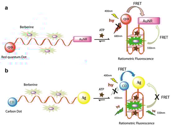 The Forster resonance energy transfer (FRET)-based ATP aptasensors. (a) ATP-binding oligonucleotide labeled with red quantum dots (RQDs) and gold nanorods (AuNRs), which in the presence of ATP and berberine, folds into a G4 structure. FRET process results in the quenching of RQD fluorescence and an increase of berberine fluorescence is simultaneously observed. (b) Ag- and CD-labeled ATP-binding oligonucleotide system forming the G4 structure in the presence of ATP and berberine [].
