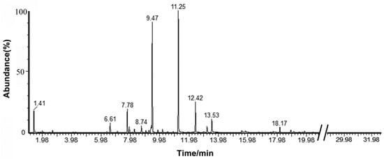 The essential compounds were identified on the basis of a comparison of their retention index (RI) relative to n-alkanes (C8~C20), standard substance, as well as published data and EI mass spectra from the literature. Compounds were further compared and their MS data authenticated to the National Institute of Standards and Technology mass spectral library (NIST). The relative mass fraction of the EO was calculated using the peak area normalization method. The formula for retention index (RI) [,] is as follows in Equation (2):