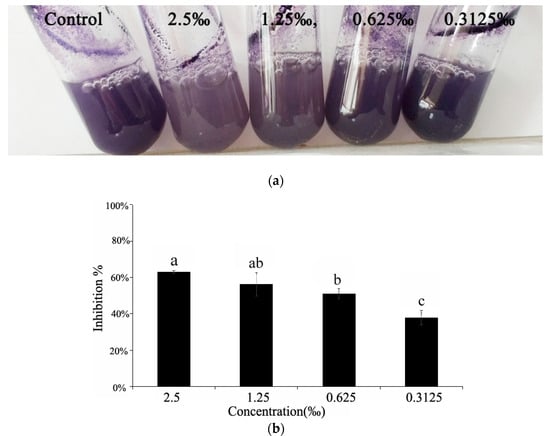 The synthesis of violacein is regulated by the QS system, and violacein is usually used as a simple and intuitive indicator for screening QSIs []. In our assay, we observed that C. camphora EO showed a notable and concentration-dependent inhibition of violacein production, which was dependent on QS regulation (Figure 4a). The results of purification and quantitative analysis of the violacein in the culture supernatant demonstrated the inhibitory effect of C. camphora EO on violacein production, and the maximum inhibition (63%) in C. violaceum occurred upon treatment with C. camphora EO at 2.5‰. (Figure 4b).
