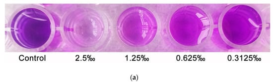 Violacein synthesis of C. violaceum strain ATCC31532 was regulated by the quorum sensing []. An overnight culture of 1% C. violaceum was added into a glass tube containing 5 mL LB broth supplemented with various concentrations (sub-MIC, 300 μL) of C. camphora EO. The mixture was incubated at 30 °C for 24 h. The specific methods were followed as described []. Briefly, 1 mL of the above solution was collected and centrifuged at 4 °C for 20 min. The supernatant was removed and 1 mL dimethyl sulfoxide (DMSO) was added to the centrifuge tube. After vortexing, the violacein was dissolved in DMSO at room temperature and centrifuged for 3 min to remove the bacterium. Violacein production was measured by UV-visible spectrophotometry at OD595, and the calculation formula was shown in Equation (3). Each assay was performed in triplicate.