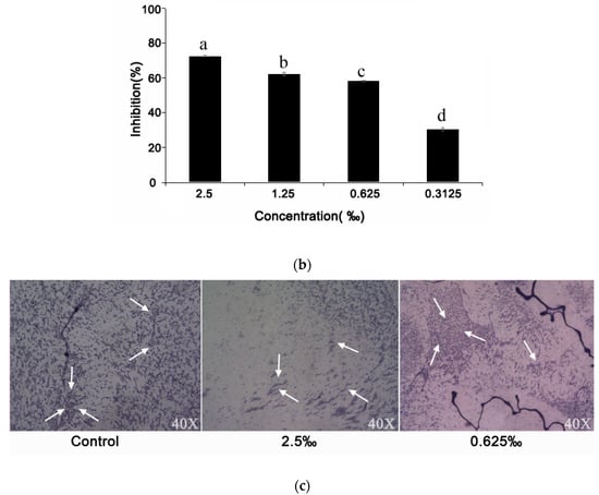 Biofilms enhance bacterial tolerance to antibiotics, environmental pressure, and attacks by the host immune system. The formation of bacterial biofilms is regulated by the QS system []. The antibiofilm activity of C. camphora EO could be observed by biofilm staining with crystal violet (CV) (Figure 5a). The quantitative results exhibited an obvious concentration-dependent reduction in the biofilm biomass of C. violaceum. The C. camphora EO at sub-MIC (2.5‰, 1.25‰, 0.625‰, and 0.3125‰) decreased the biofilm biomass by 77.64%, 69.21%, 64.03%, and 26.83%, respectively (Figure 5b). In addition, we found that C. camphora EO influenced biofilm formation. Compared with the control group, the biofilms of C. violaceum in the EO-treated groups were distributed loosely and did not aggregate (Figure 5c).