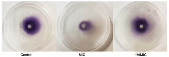 Swarming movement refers to the use of flagella to migrate from the inoculation point to the surrounding area. This colony-level activity depends on bioactive substances on the surface of the medium in a colony manner []. Swarming plays an important role in the preliminary stage of QS-regulated bacterial biofilm formation. Our results showed that C. camphora EO inhibited the swarming motility behavior of C. violaceum, and clear inhibition was observed upon treatment with sub-MICs (2.5‰ and 0.625‰) (Figure 6).