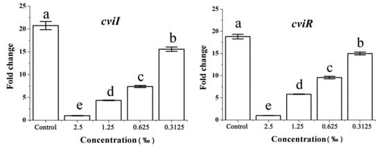 We further assessed the effects of C. camphora EO on the expression of QS genes in strain C. violaceum by RT-qPCR. As expected, the expression of the cviI and cviR genes decreased with an increase of C. camphora EO concentration and displayed the concentration-dependent change, independent of a direct effect on growth rate (Figure 7).