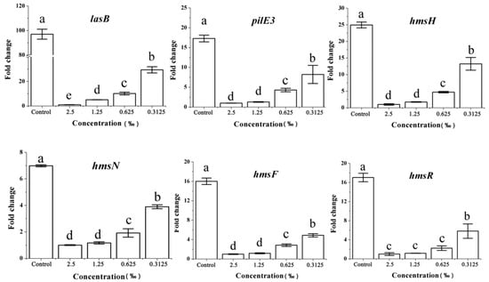 Violacein synthesis and biofilm formation are important virulence factors in C. violaceum. Accordingly, we also evaluated the effect of C. camphora EO on the expression levels of genes that are directly involved in violacein synthesis and biofilm formation, including vioABCDE and hmsHNFR. These genes are downstream of the QS cascade and are strictly controlled by the QS system []. The relative expression of the gene clusters vioA, vioB, vioC, vioD, vioE, hmsH, hmsN, hmsF, and hmsR were clearly reduced by C. camphora EO relative to the control group (Figure 8). Furthermore, the effect of C. camphora EO on the relative expression of genes lasA-B and pilE3, encoding bacterial elastase and pilus, respectively, was assessed. lasA and lasB genes may be involved in limiting the host response, activating inappropriate host responses []. PilE3, which encodes a type IV pilus protein, and these fimbriae are involved in the enhancement of QS over aggregation and biofilm formation []. These genes have been associated with virulence in C. violaceum, but their expression has not been reported to be directly associated with QS. Consistent with the clear effect observed on QS and QS-regulated genes, the expression of lasA-B and pilE3 was affected by exposure to the C. camphora EO (Figure 8).