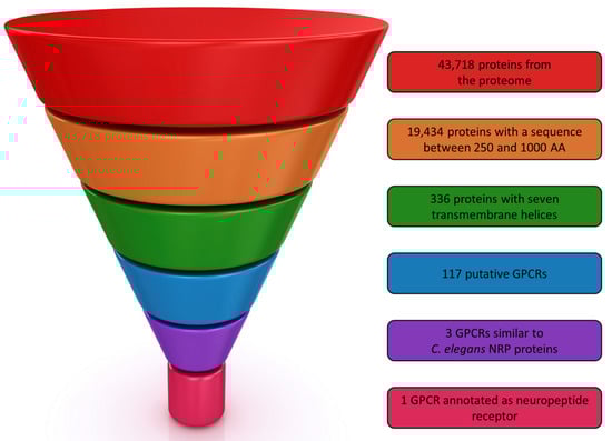 - Frooninckx, L.; Van Rompay, L.; Temmerman, L.; Van Sinay, E.; Beets, I.; Janssen, T.; Husson, S.J.; Schoofs, L. Neuropeptide GPCRs in C. elegans. Front. Endocrinol. 2012, 3, 167. [Google Scholar] [CrossRef] [PubMed]