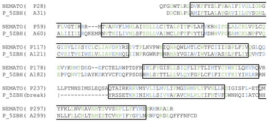 Sequence alignment used for the homology modelling: alignment between Minc3s00007g 00462 (NEMATO) and the human neuropeptide Y Y1 receptor (PDB structure 5ZBH [33]). Identical residues are in green, similar residues are in blue and the helices sequences in black rectangles.