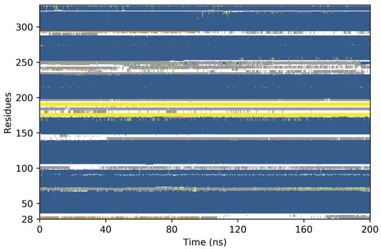 Evolution of the secondary structure during the 100 ns Molecular Dynamics (MD) (blue: -helices, yellow: -sheets, green: 3 helices, gray: turns, white: coils).