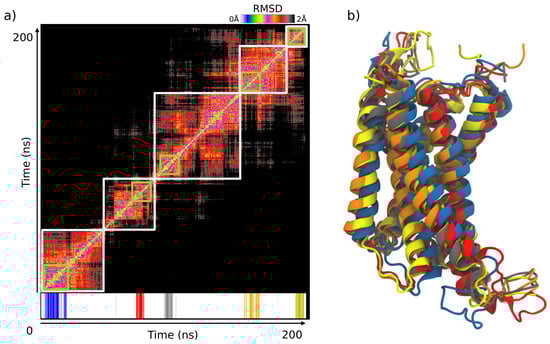 Once the MD simulations finished, all the frames were aligned on the first frame to calculate RMSDs with VMD (“RMSD trajectory tool” plugin) [69]. An RMSD map was built by a previously developed in-house TCL script.