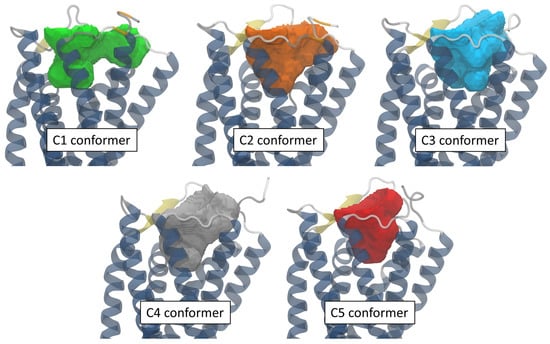 Shape and position of the binding pockets obtained for the 5 MD conformers retained for the ensemble docking with the 3V web server [34].