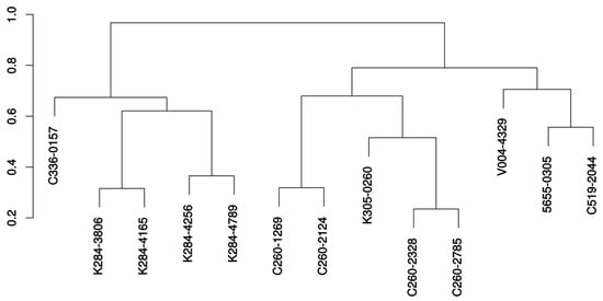 Dendrogram showing the clustering of the 13 retained molecules. The dendrogram was built with Ward’s method using Tanimoto scores.