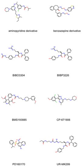 Apart from peptide-related compounds, few small molecular weight organic compounds were also reported in the literature. Besides BIBP-3226, which was the first selective neuropeptide Y1 receptor (NPY Y1R) antagonist found in 1996 [36]. Some of the proposed compounds were based on: benzazapine nuclei [37], phenoxyquinlines [38], substituted alkoxy-aminopyridine groups [39], pyrazolo-pyrimidines fragments [40] and pyridinedicarboxylic acid derivatives such as BMS-193885 [41], on carbamoylation of argininamide moities such as UR-MK299 [42]. Recently, the two last antagonists, namely UR-MK299 and BMS-193885 were used in the X-ray study presenting the 3D structure of the NPY Y1R in complex with these molecules. Figure 13 lists and presents the chemical formulas of these compounds.