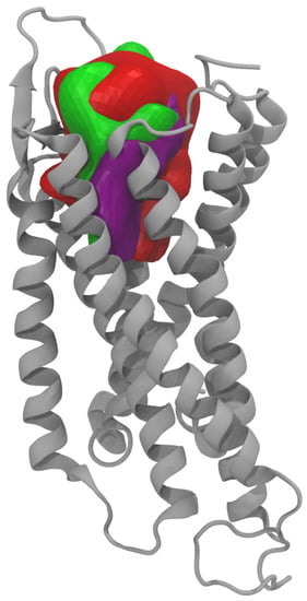 For this purpose, we used molecular dynamics simulation on the receptor homology models that were embedded in a fully hydrated POPC bilayer [66]. No ligand was positioned within the receptor at this level as it has been shown [67] that the presence of a ligand does not change the accuracy of the structure produced. Initially, the receptors models were positioned across the equilibrated bilayer while seeking to match the hydrophobic protein segments with the layer formed by the lipid hydrocarbon tails. Lipids overlapping with the protein complex were deleted, leaving a bilayer consisting of 584 POPC molecules. To ascertain that the cytoplasmic and extracellular loops did not interact, an amount of 79,089 water molecules was added, as well as 16 chloride counter ions to make the whole system-neutral, thus making a total number of atoms equal to 328,547. The complete system, represented in Figure 4 was replicated periodically in the three directions of space, with a repeat distance of ≈130 Å.