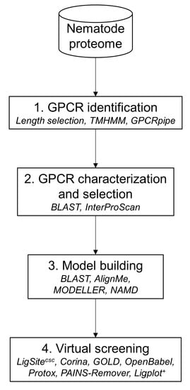 The in silico approach was composed of four main steps as illustrated in Figure 15 (more details regarding the methods please see Supplementary Materials). The first step was to filter the proteomic dataset from the nematode to identify GPCRs using several filters (sequence length selection, transmembrane helices prediction and GPCR prediction tool. Next, the GPCRs candidates were characterized in order to select a limited number of possible targets using sequence similarity. The third step consisted to build a 3D model of the selected GPCR candidate and to validate it by a 100 ns molecular dynamics simulation. The last step was to submit the GPCR candidate stable model to the virtual screening in order to identify probable molecules to inhibit the target.